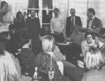 Den ganzen Tag über diskutierten die Jugendlichen mit den Gruppenleitern Dr. Arnold Ibing, Dr. Christian IIlies, Waltraud Kreft und Klaudius Gansczyk über Werte als Kernstück des neuen Denkens, über die Menschenpflichtserklärung von 25 Staatspräsidenten aus aller Welt. Auch bei Tisch gingen die Gespräche weiter, begleitet von leiser Musik des Trios "JAT" - Jan, Alex und Tim.